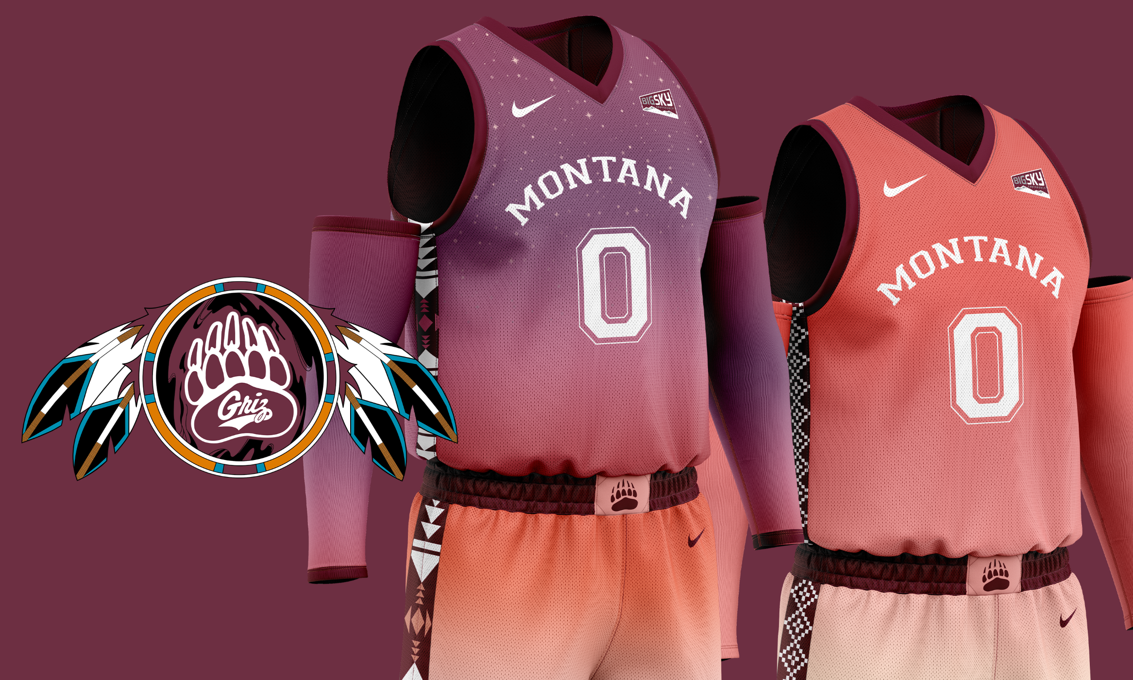 The University of Montana located in Missoula, Montana, with a distinctive basketball identity, including the women’s team known as the Lady Griz. The design integrates Kalispell and Salish tribal patterns alongside sunrise and sunset colors inspired by Montana’s Big Sky Country, reinforcing a strong sense of place.